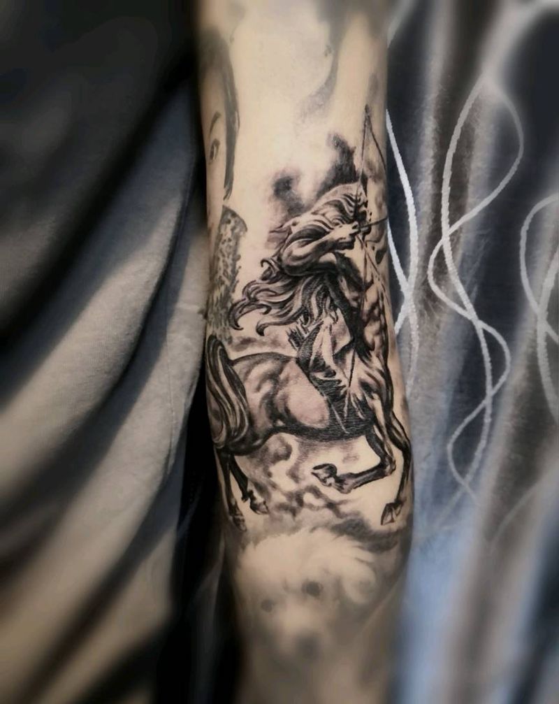 当前位置: 首页 >云南省昆明市纹身店-雕衍刺青纹身图案>射手座纹身图片_手臂欧美写实纹身图案