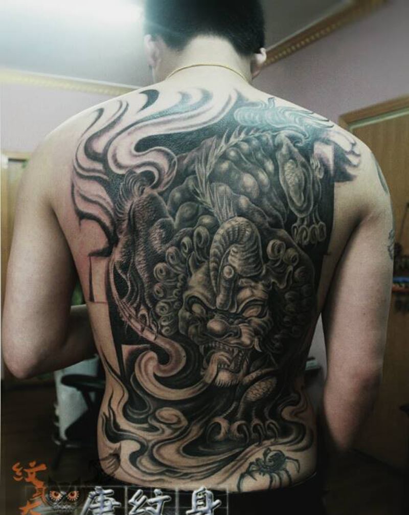当前位置: 首页 >云南省昆明市纹身店-雕衍刺青纹身图案>招财神兽纹身图片_背部传统动物纹身图案