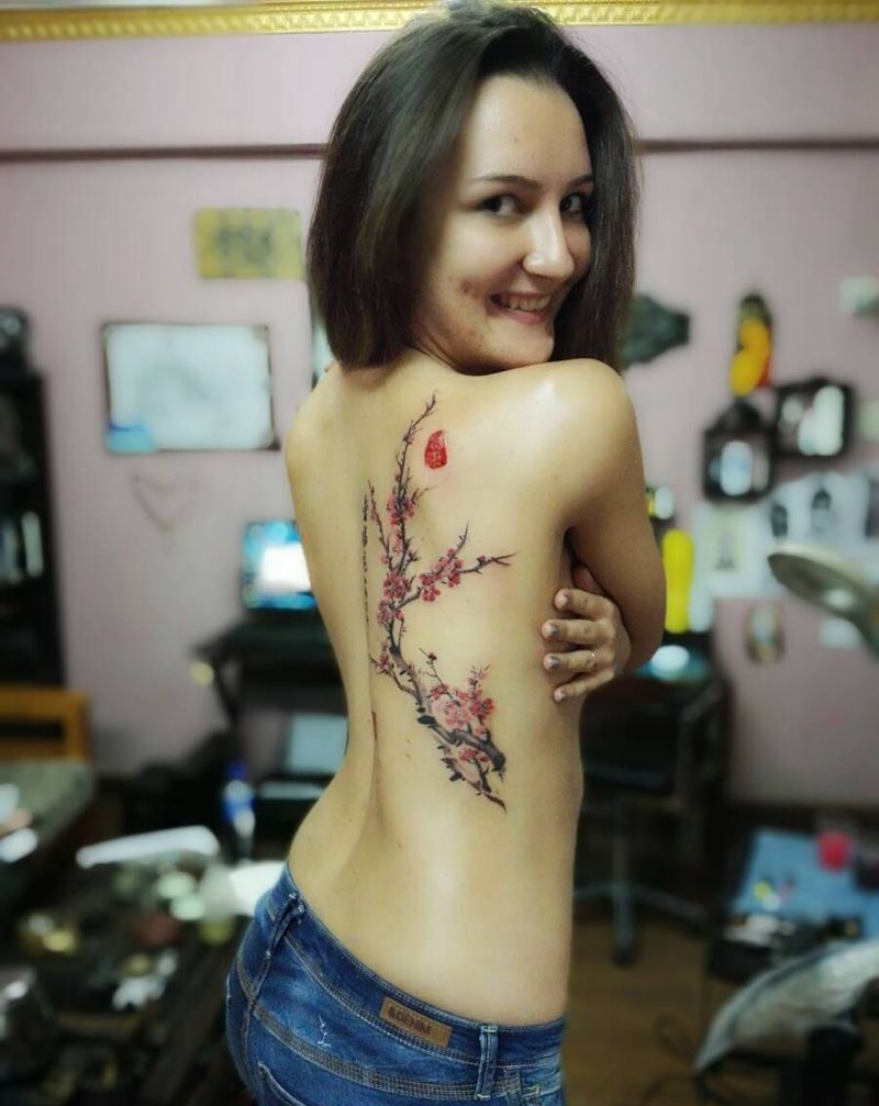 乌克兰美女的中国情结纹身图片_背部传统国画植物原创纹身图案