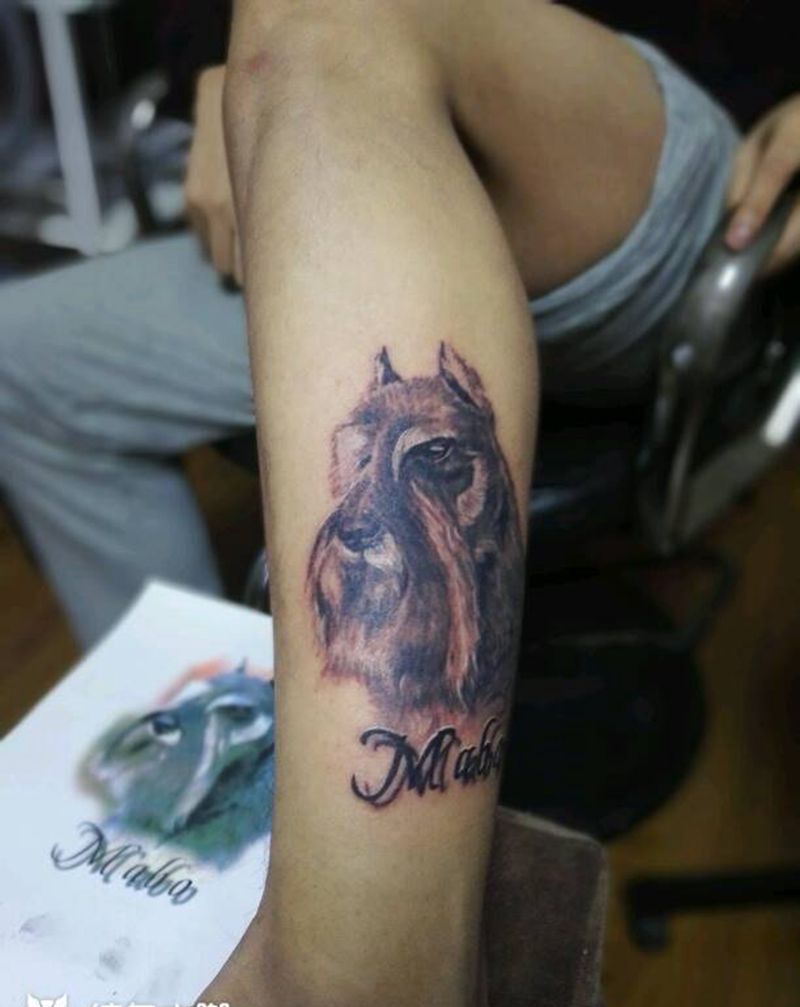 当前位置: 首页 >云南省昆明市纹身店-雕衍刺青纹身图案>雪纳瑞纹身图片_腿部写实动物纹身图案