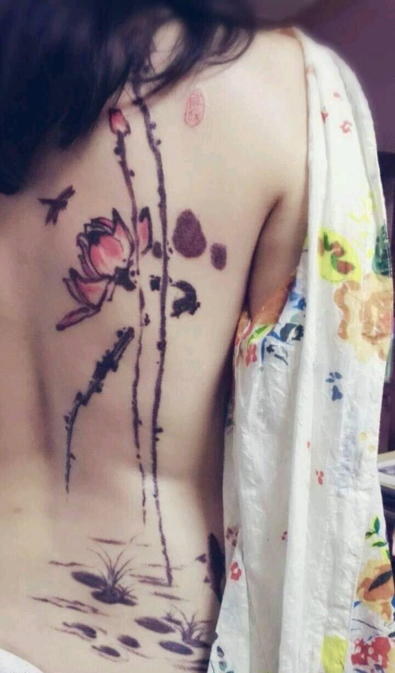 水墨荷花纹身图片_背部国画原创成品纹身图案