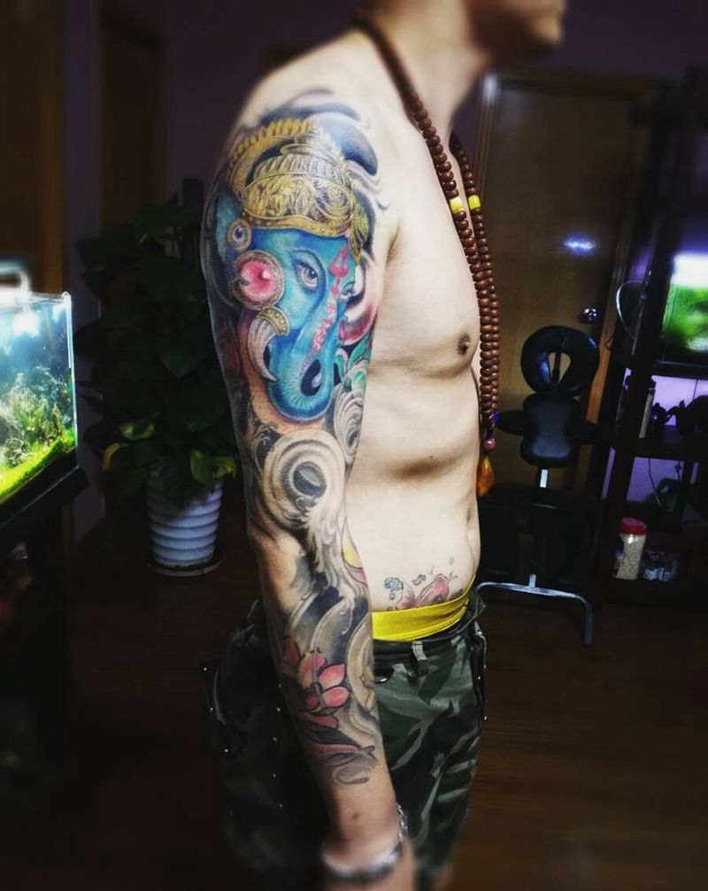 当前位置: 首页 >云南省昆明市纹身店-雕衍刺青纹身图案>象财神花臂纹身图片_手臂传统原创成品纹身图案