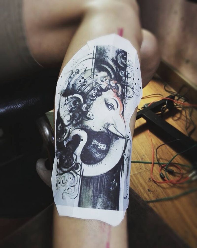 当前位置: 首页 >云南省昆明市纹身店-雕衍刺青纹身图案>象神纹身图片_腿部传统鬼神原创成品纹身图案