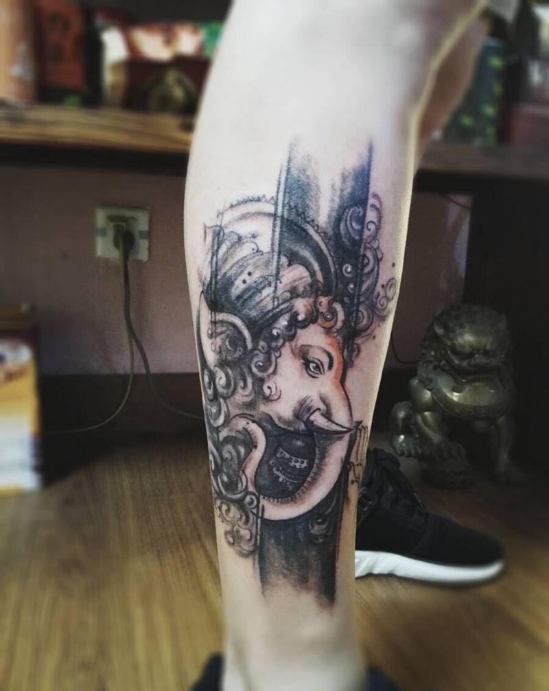 当前位置: 首页 >云南省昆明市纹身店-雕衍刺青纹身图案>象神纹身图片_腿部传统鬼神原创成品纹身图案