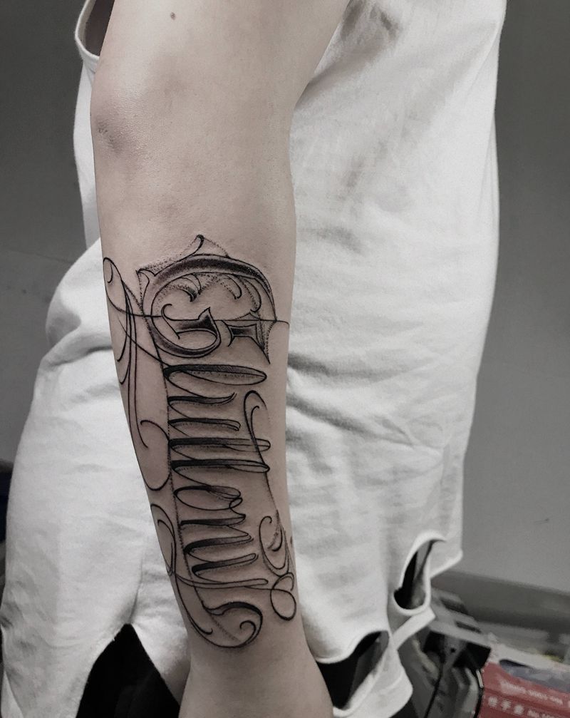 当前位置: 首页 >广东省东莞市纹身店-刺青堂纹身纹身图案>哥特英文花体纹身图片_手臂欧美写实水墨纹身图案