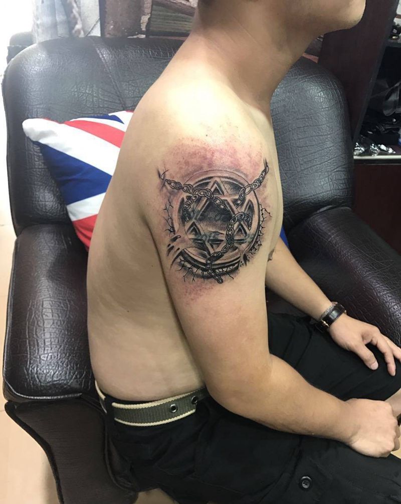 当前位置: 首页 >广东省揭阳市纹身店-恩刺青纹身纹身图案>旧图添加六芒星纹身图片_成品手臂清新写实传统几何原创静物揭阳纹身图案