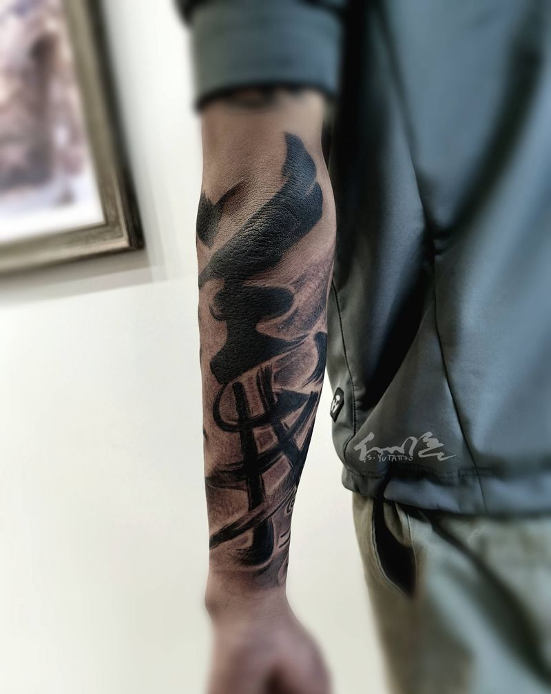 当前位置: 首页 >云南省丽江市纹身店-亖 刺青工作室纹身图案>义纹身图片_手臂水墨书法纹身图案