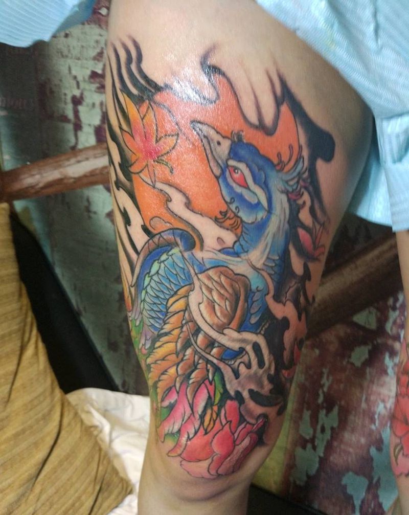 • T网红王老大花腿龙纹身图片_腿部新传统纹身图案