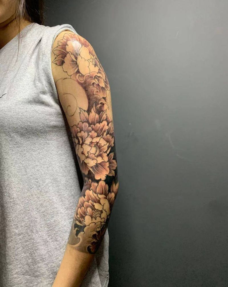 牡丹七分袖未完成纹身图片_手臂肩部新传统老传统纹身图案