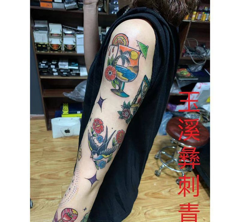 当前位置: 首页 >云南省玉溪市纹身店-彝.刺青纹身图案>拼接小花臂纹身图片_手部手臂New School水彩纹身图案