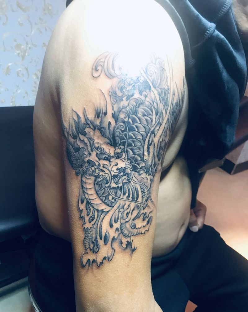 • T网红王老大花腿龙纹身图片_腿部新传统纹身图案