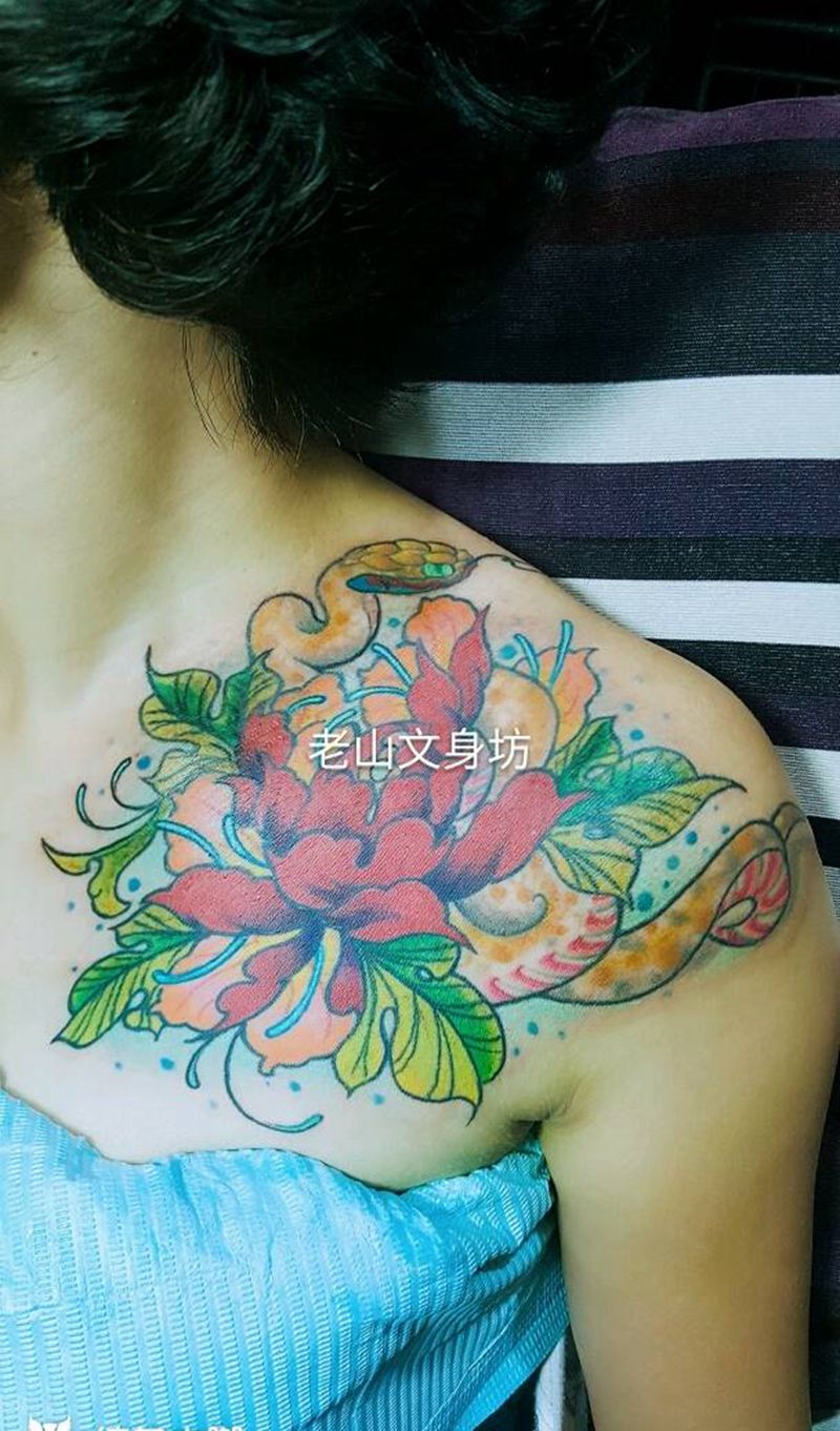 当前位置: 首页 >云南省昭通市纹身店-老山纹身坊纹身图案>蛇盘牡丹纹身图片
