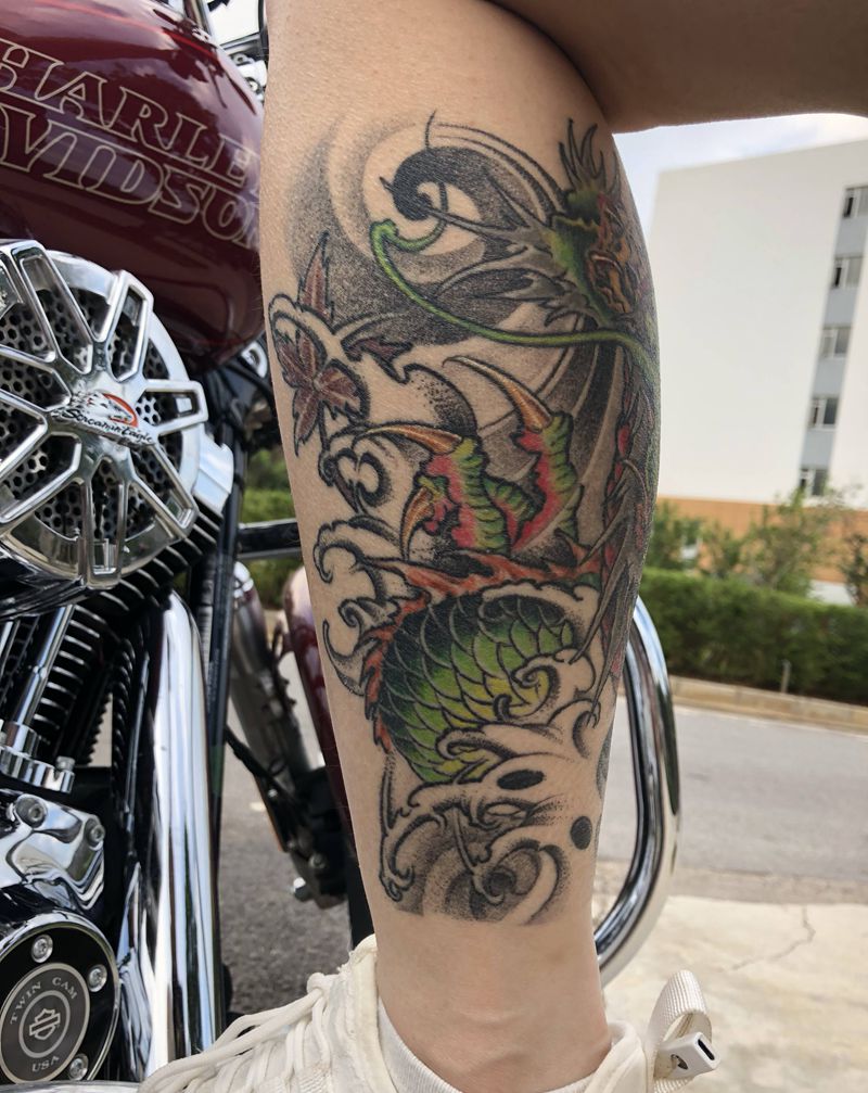 • T网红王老大花腿龙纹身图片_腿部新传统纹身图案
