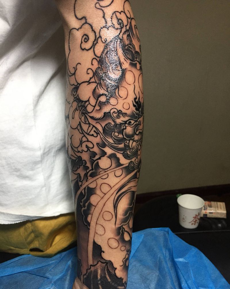 当前位置: 首页 >云南省昭通市纹身店-T-刺青纹身图案>唐狮黑灰纹身图片_手臂新传统纹身图案