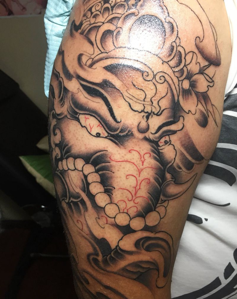 当前位置: 首页 >云南省昭通市纹身店-T-刺青纹身图案>象神黑灰纹身图片_手臂新传统纹身图案