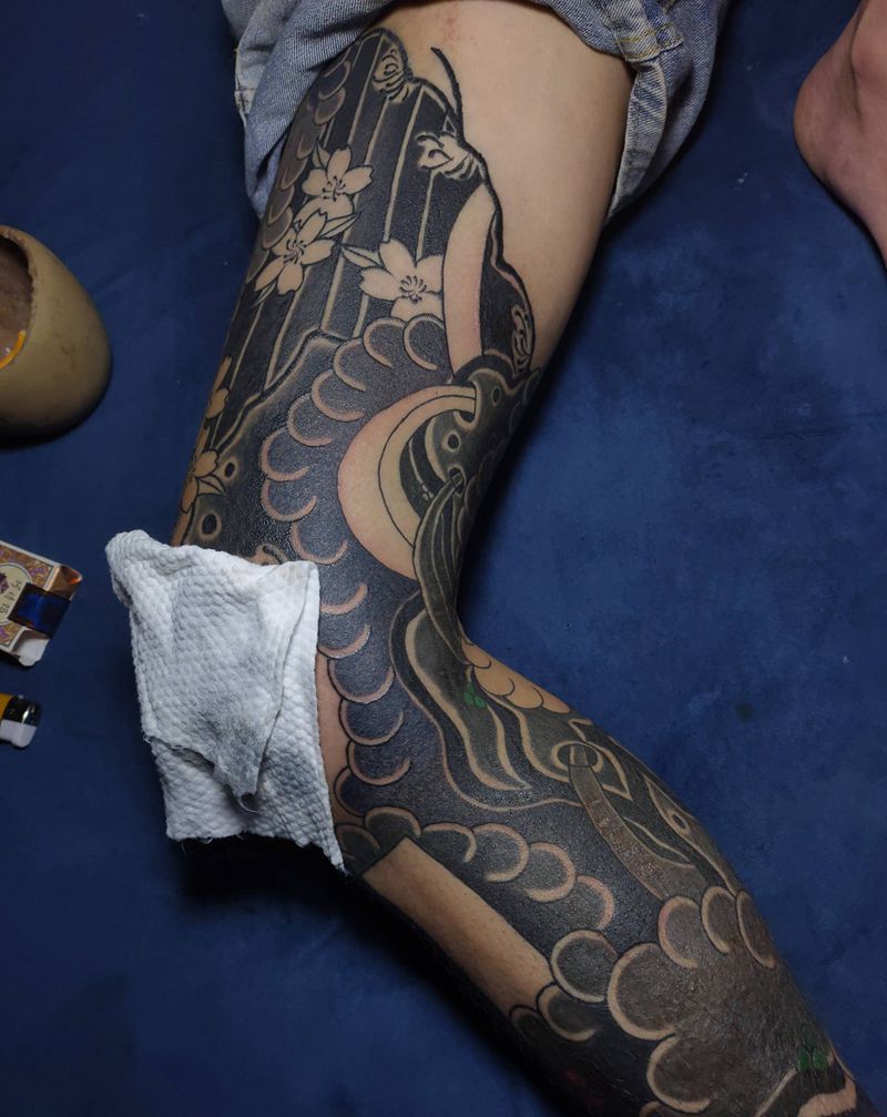 • T网红王老大花腿龙纹身图片_腿部新传统纹身图案