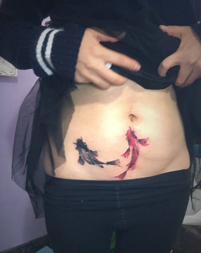 刨腹产疤痕和阑尾手术疤痕纹身图片_腹部成品国画动物纹身图案