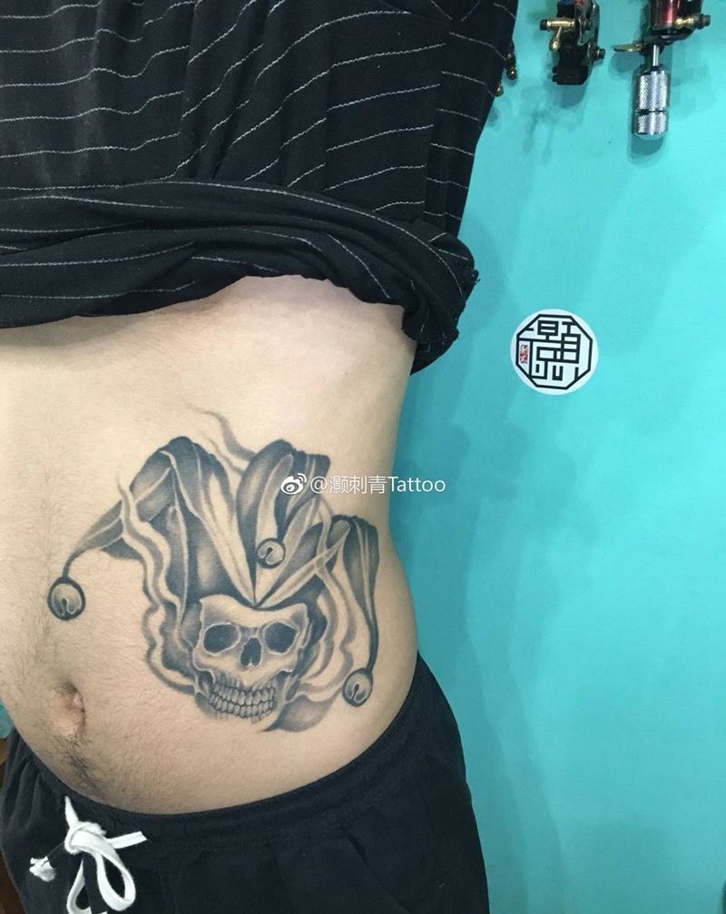 骷髅小丑.纹身图片_腰部黑灰素描纹身图案