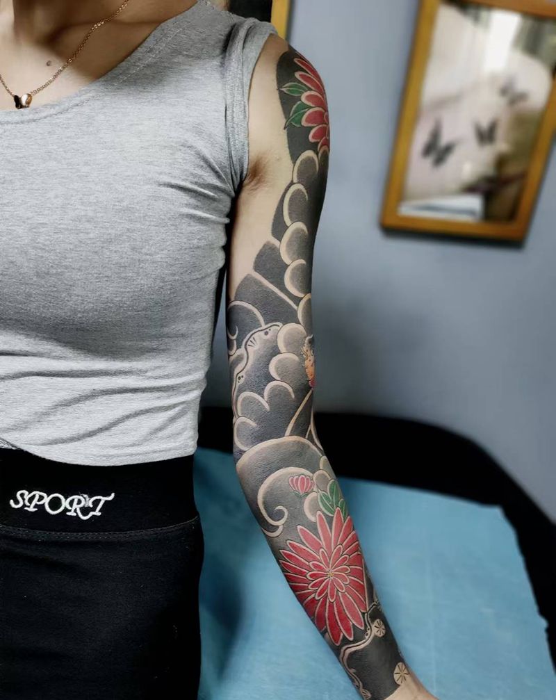 花臂遮盖纹身图片_手部手臂老传统新传统日式老传统遮盖纹身图案