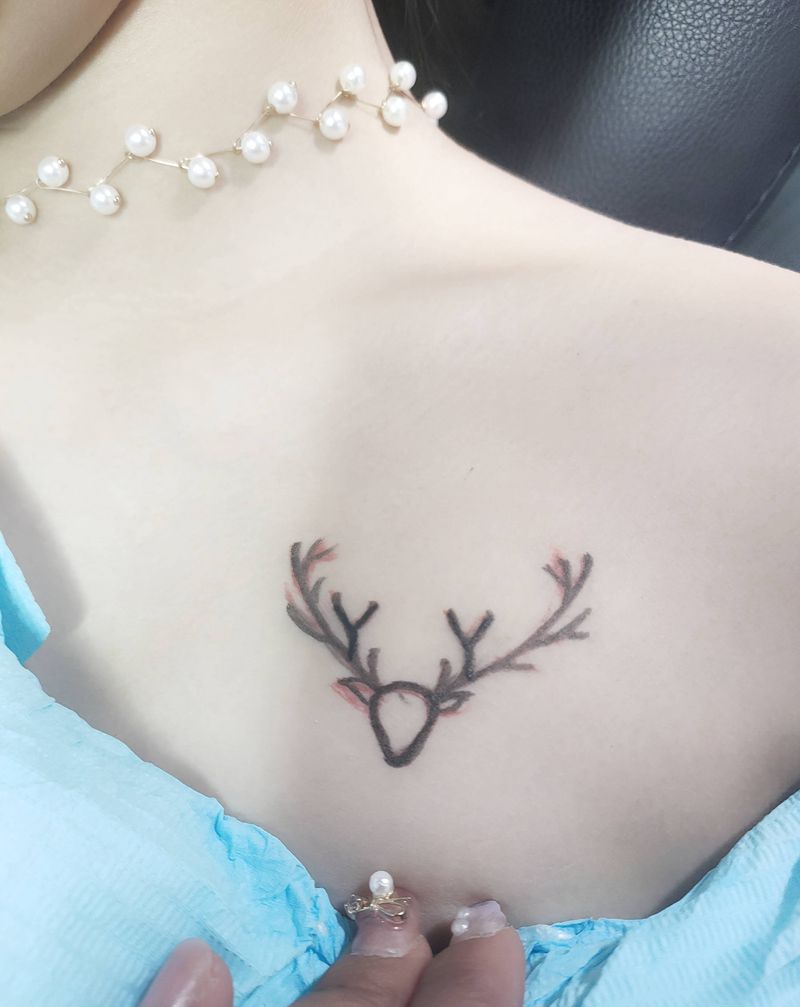 鹿头纹身图片_胸部肩部几何新传统遮盖修改纹身图案