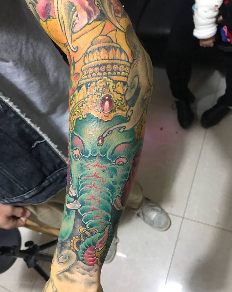当前位置: 首页 >云南省楚雄彝族自治州纹身店-江一刺青纹身图案>招财貔貅象神花臂!纹身图片