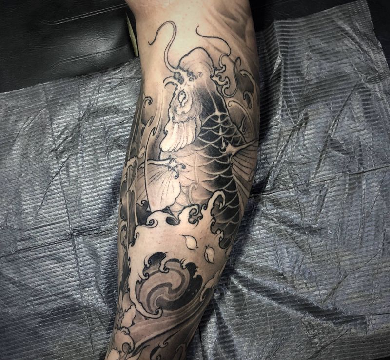 当前位置: 首页 >云南省楚雄彝族自治州纹身店-江一刺青纹身图案>鲤鱼纹身图片_手臂腿部新传统鲤鱼纹身图案