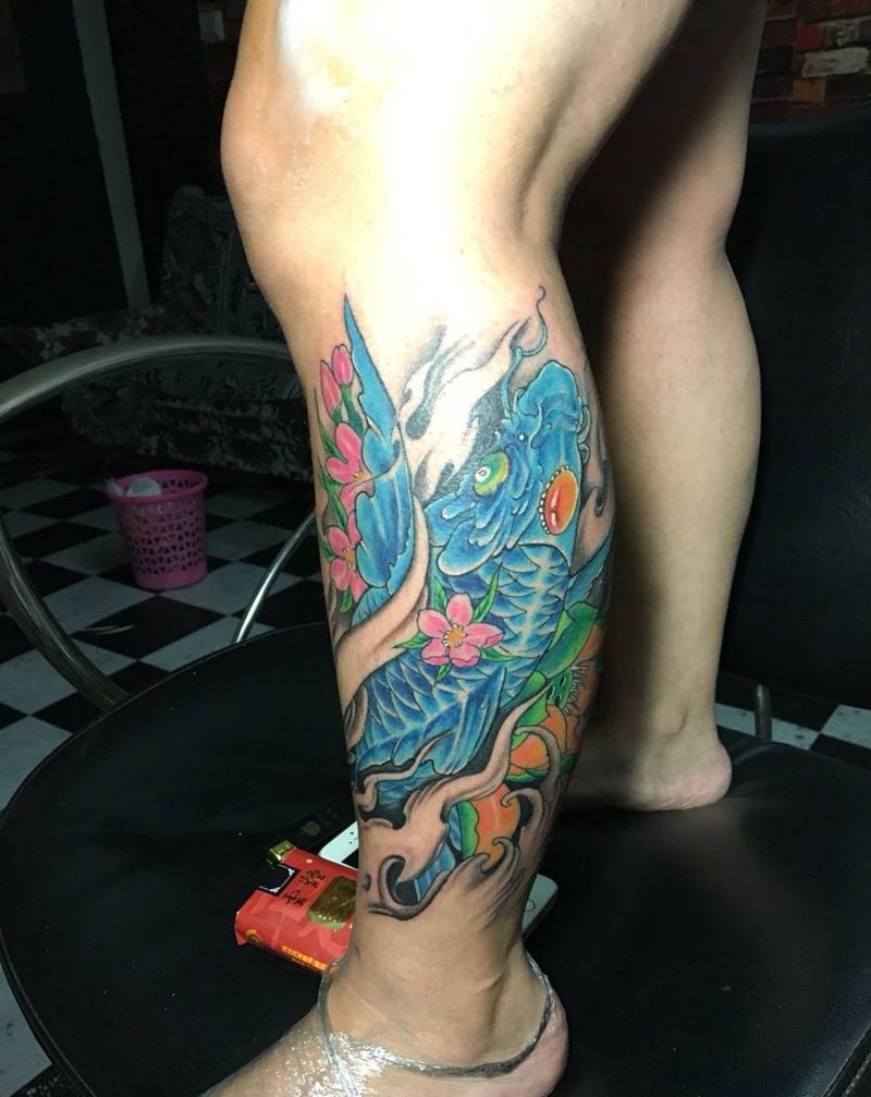 • T网红王老大花腿龙纹身图片_腿部新传统纹身图案
