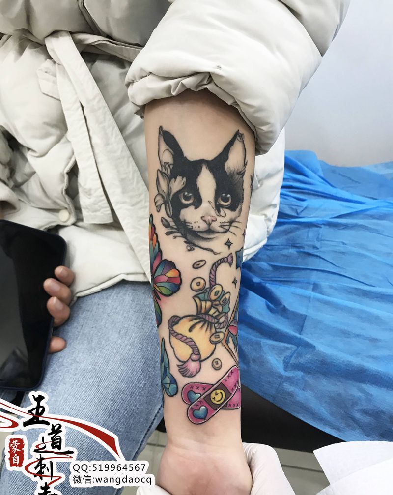 当前位置: 首页 >云南省红河哈尼族彝族自治州纹身店-蒙自王道刺青纹身图案>拼接纹身图片_手臂手部New School水彩花臂猫小清新纹身图案