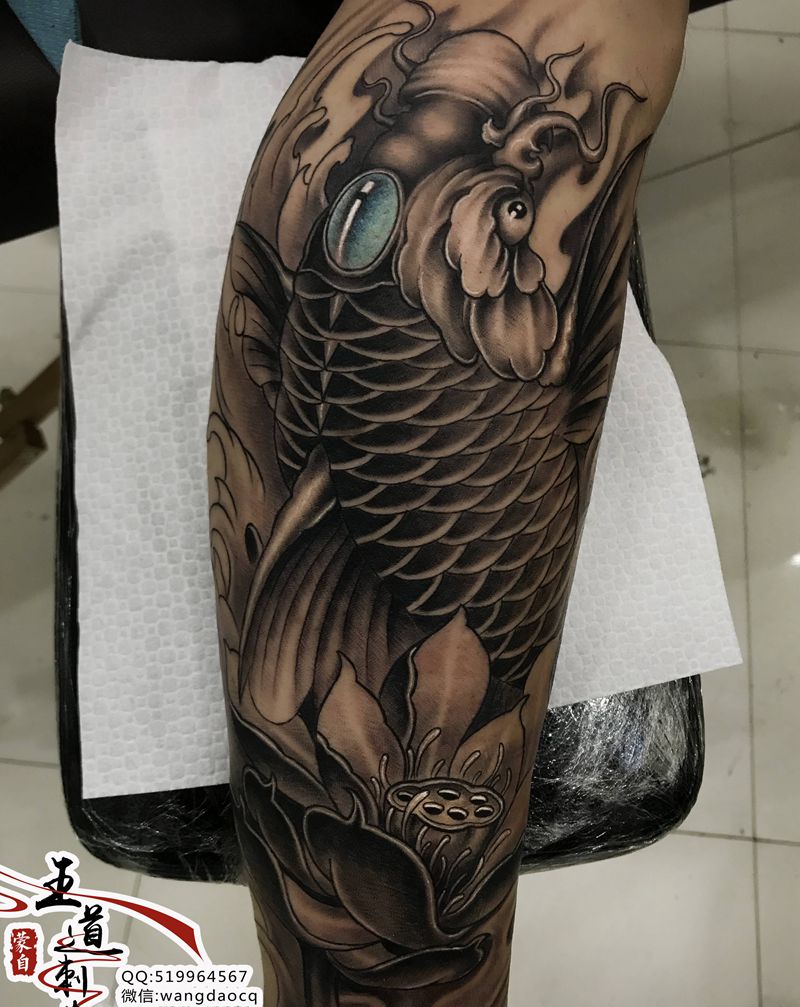 鲤鱼纹身图片_手部手臂新传统欧美写实鲤鱼花腿花臂纹身图案