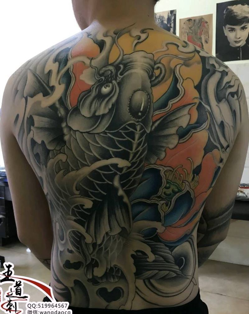 当前位置: 首页 >云南省红河哈尼族彝族自治州纹身店-蒙自王道刺青纹身图案>满背鱼纹身图片_背部新传统欧美写实满背鱼花臂纹身图案