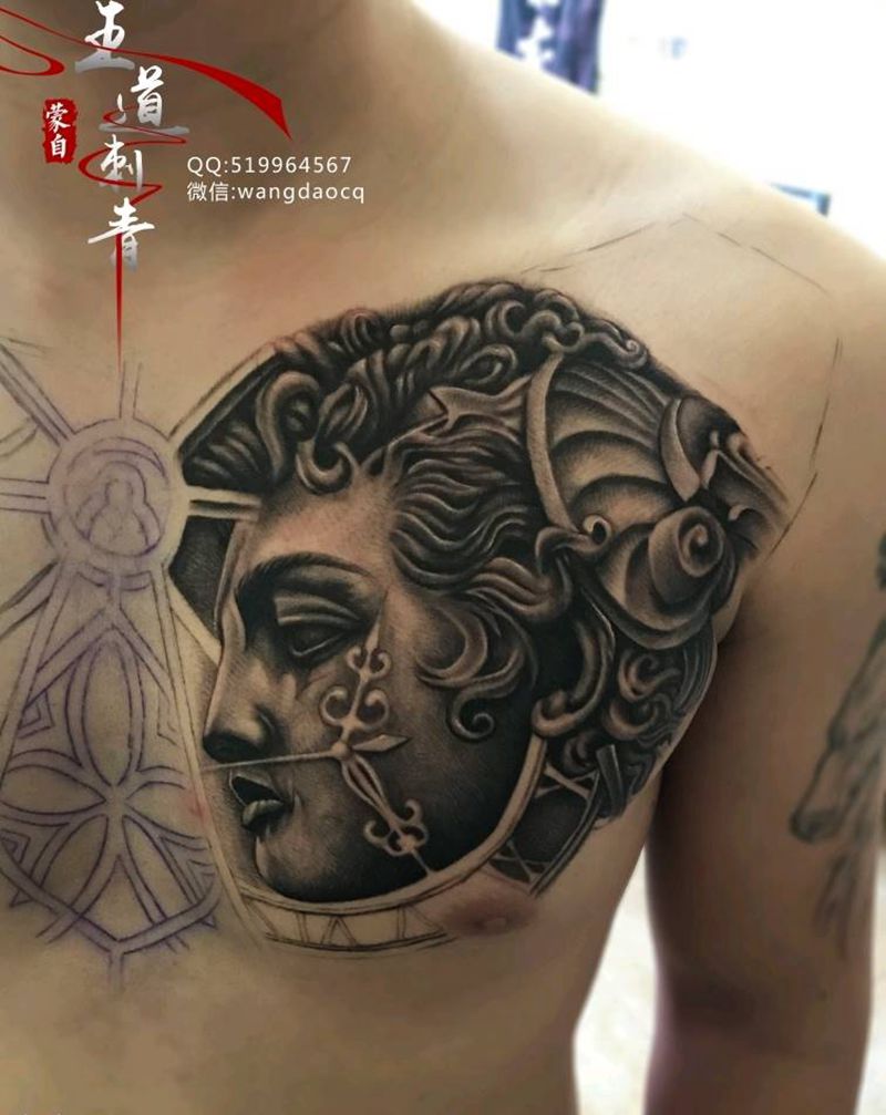 美杜莎纹身图片_胸部肩部欧美写实新传统美杜莎圣母耶稣纹身图案