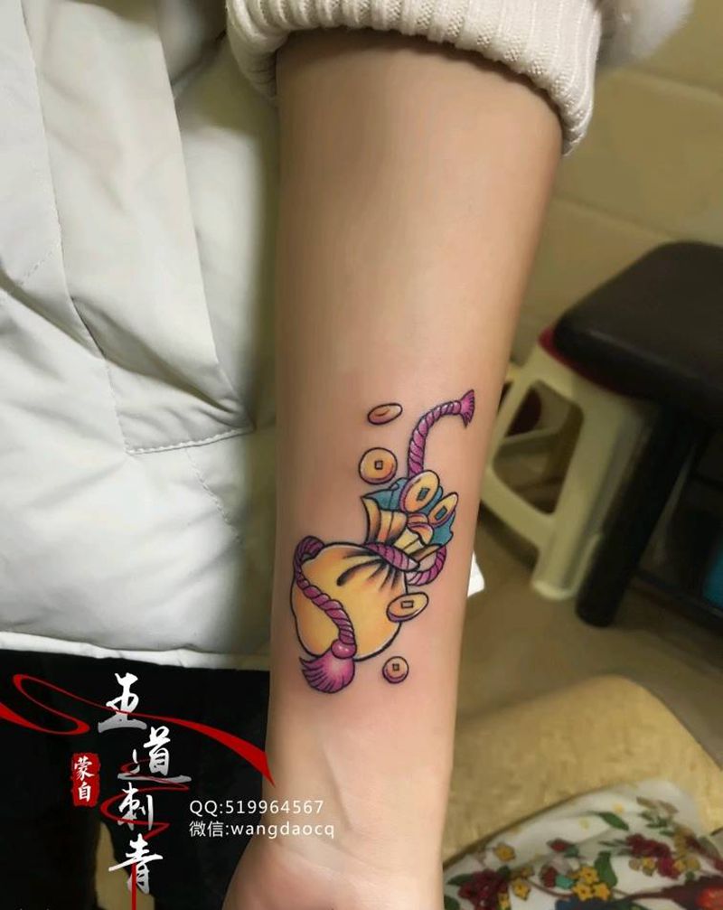 当前位置: 首页 >云南省红河哈尼族彝族自治州纹身店-蒙自王道刺青纹身图案>钱袋纹身图片_手臂手部New School水彩福袋钱袋钱纹身图案