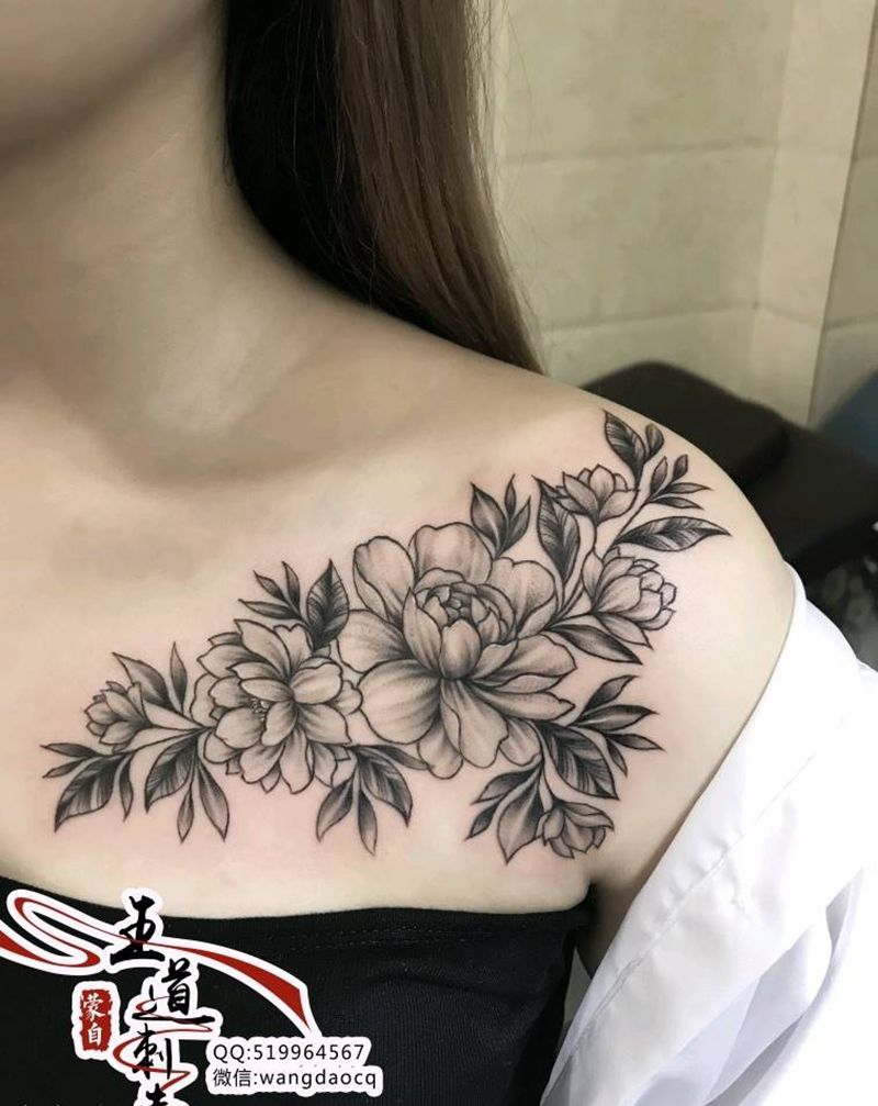 素花纹身图片_胸部肩部欧美写实新传统素花肩花玫瑰纹身图案