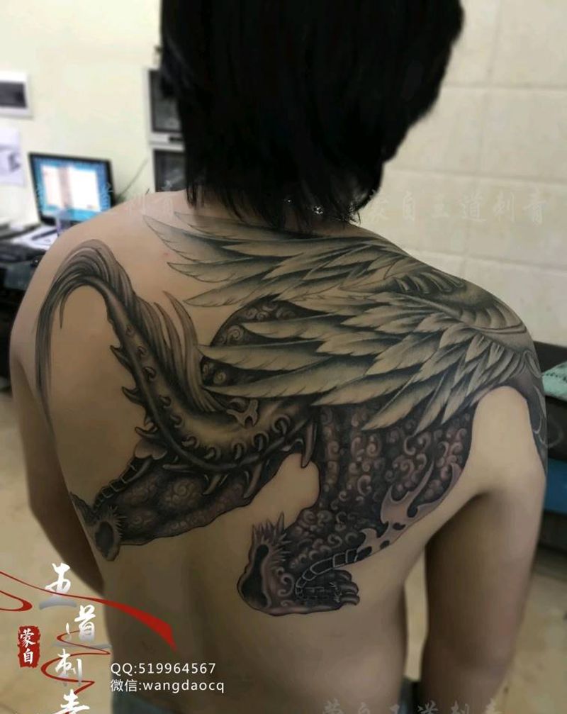 当前位置: 首页 >云南省红河哈尼族彝族自治州纹身店-蒙自王道刺青纹身图案>穷奇纹身图片_肩部背部新传统穷奇神兽纹身图案