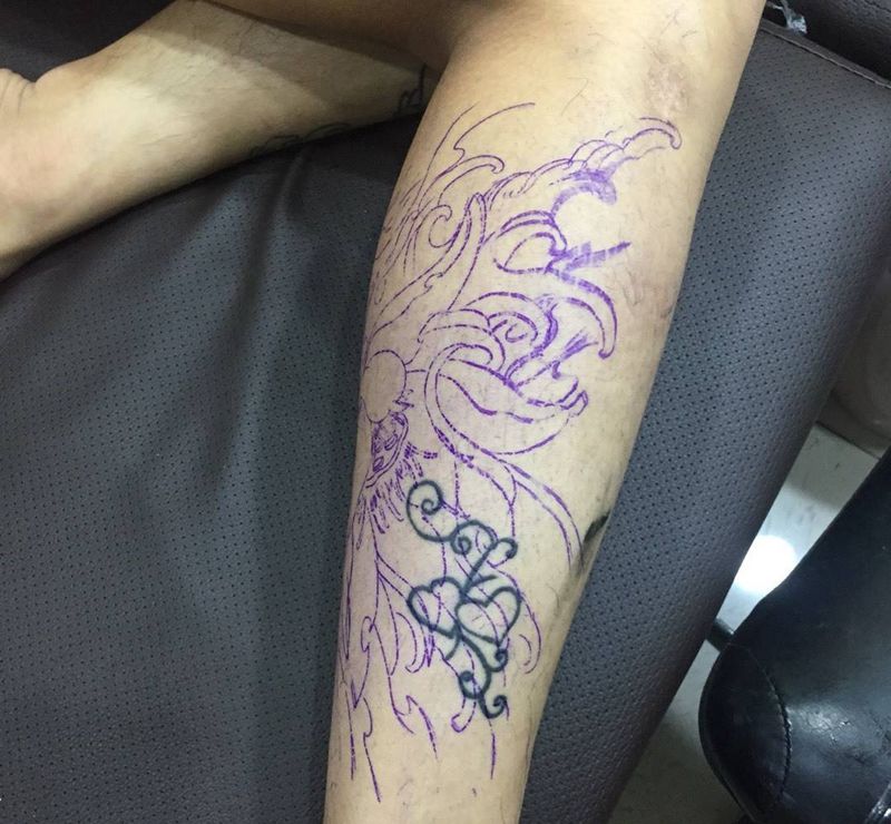 • T网红王老大花腿龙纹身图片_腿部新传统纹身图案