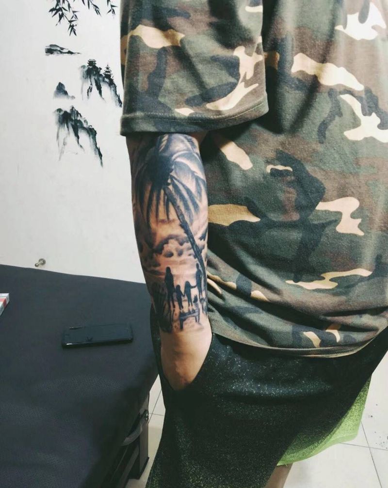 当前位置: 首页 >云南省文山苗族自治州纹身店-雕金堂纹身图案>迷彩服加此纹身图似乎有点味道!纹身图片