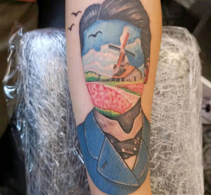 • T包小腿吹火男+阿多福纹身图片_腿部老传统新传统吹火男阿