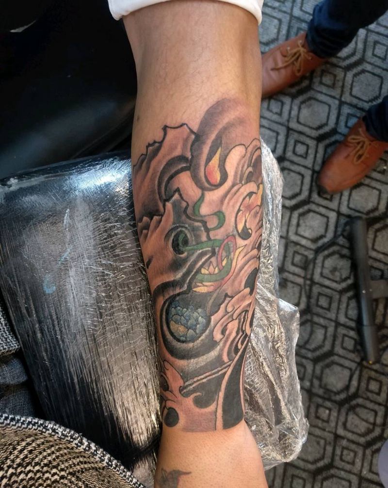 • T包小腿吹火男+阿多福纹身图片_腿部老传统新传统吹火男阿