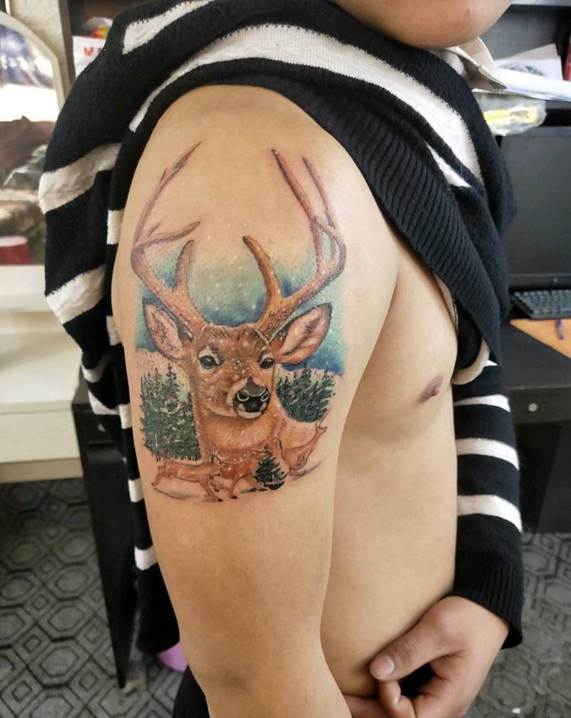 当前位置: 首页 >云南省文山苗族自治州纹身店-雕金堂纹身图案>鹿头纹身图片_手部欧美写实新传统纹身图案