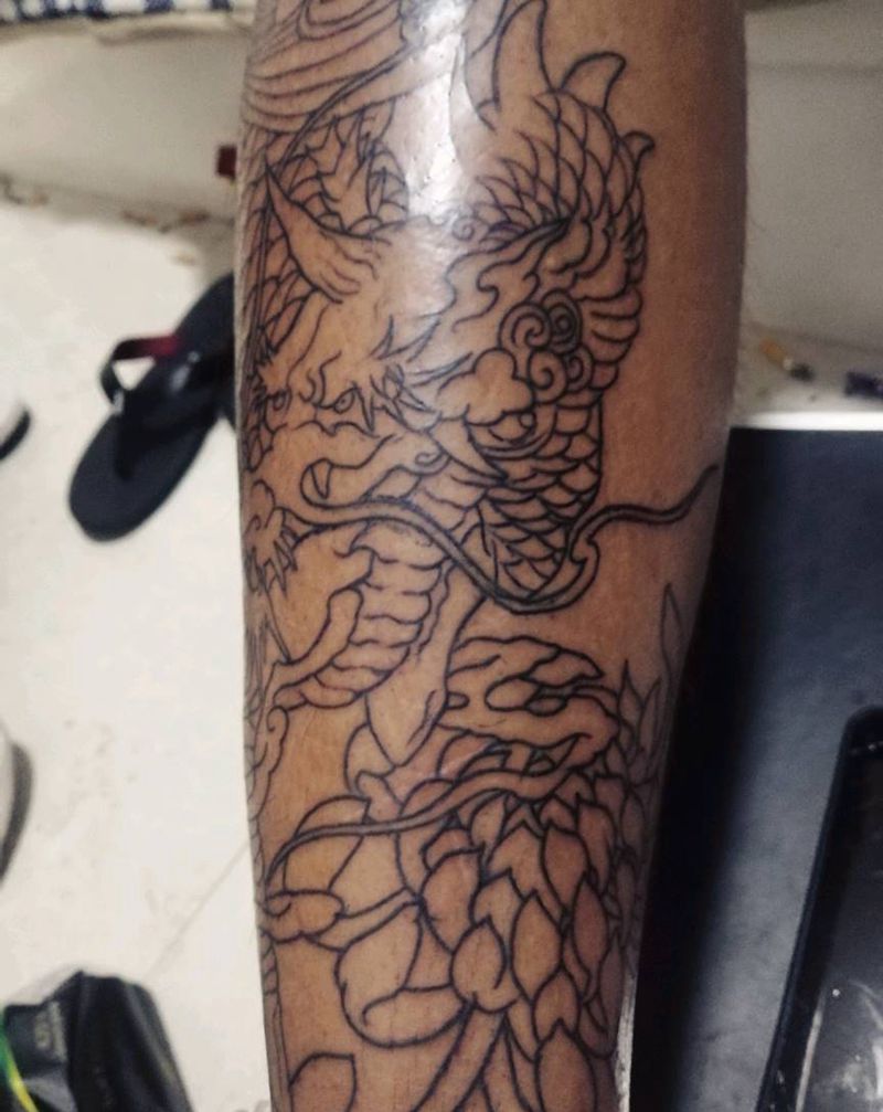 • T网红王老大花腿龙纹身图片_腿部新传统纹身图案