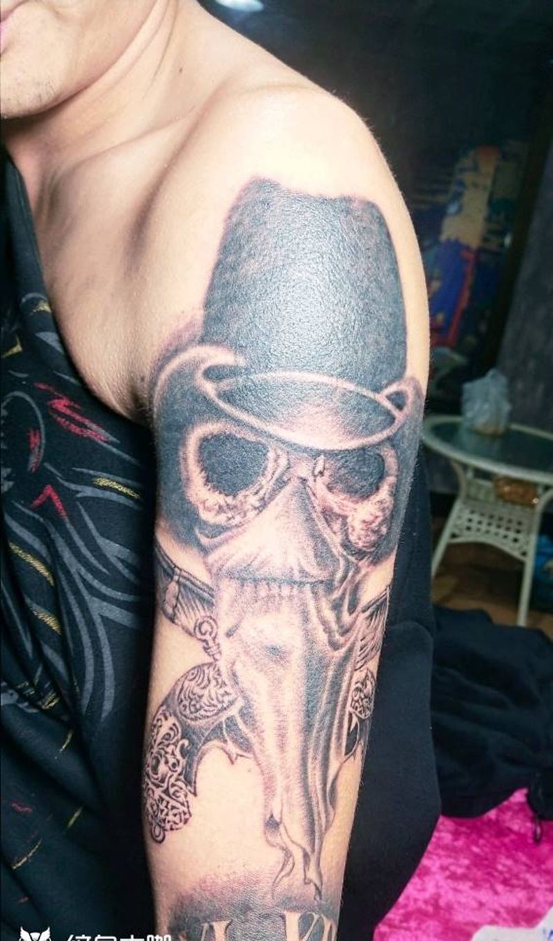 当前位置: 首页 >云南省红河哈尼族彝族自治州纹身店-刺痛刺青纹身图案>骷髅抢手遮盖纹身图片_手臂欧美写实纹身图案