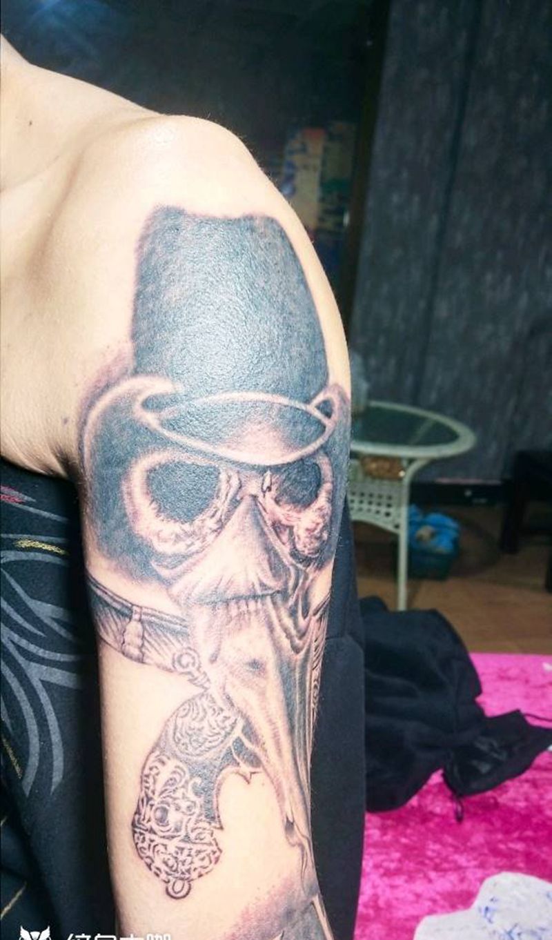 当前位置: 首页 >云南省红河哈尼族彝族自治州纹身店-刺痛刺青纹身图案>骷髅抢手遮盖纹身图片_手臂欧美写实纹身图案