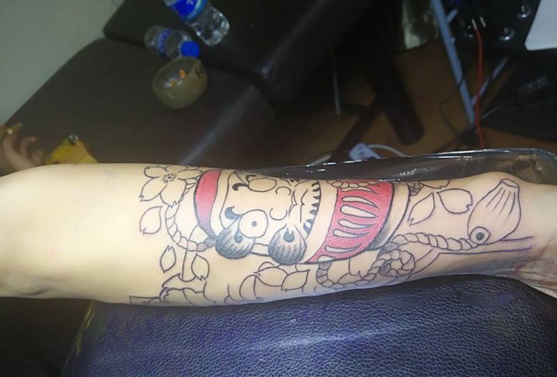 • T包小腿吹火男+阿多福纹身图片_腿部老传统新传统吹火男阿