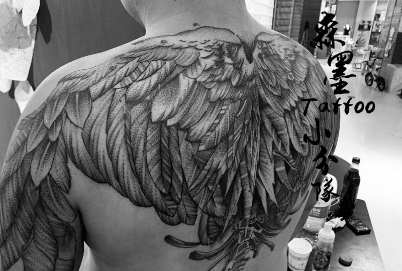 翅膀纹身图片_背部点刺纹身图案