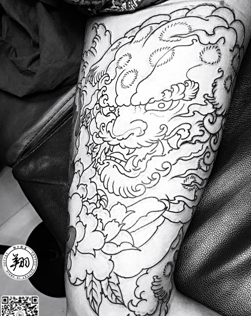 牡丹唐狮~纹身图片_腿部新传统纹身图案