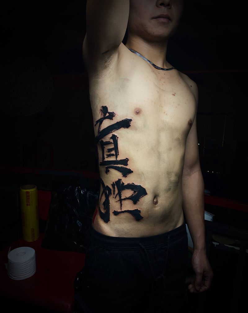 《慎独》书法纹身图片_腹部水墨纹身图案