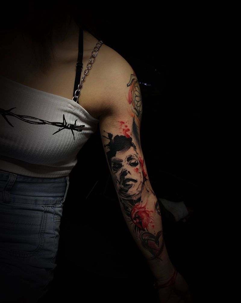 当前位置: 首页 >云南省红河哈尼族彝族自治州纹身店-MD刺青俱乐部纹身图案>人物纹身图片_手臂水彩纹身图案