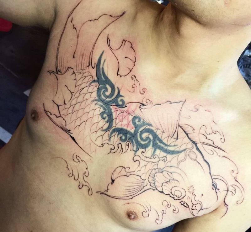 早期传统作品(鲤鱼遮盖纹身图片_胸部新传统纹身图案