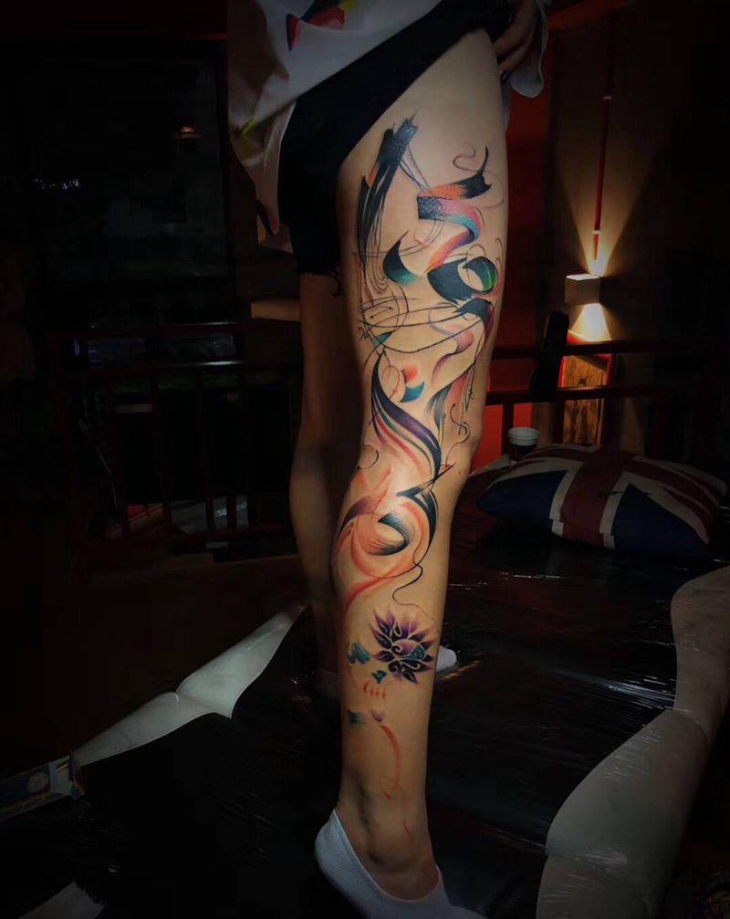 • T网红王老大花腿龙纹身图片_腿部新传统纹身图案