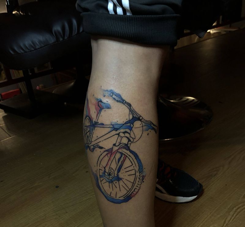 自行车纹身图片_腿部水彩纹身图案